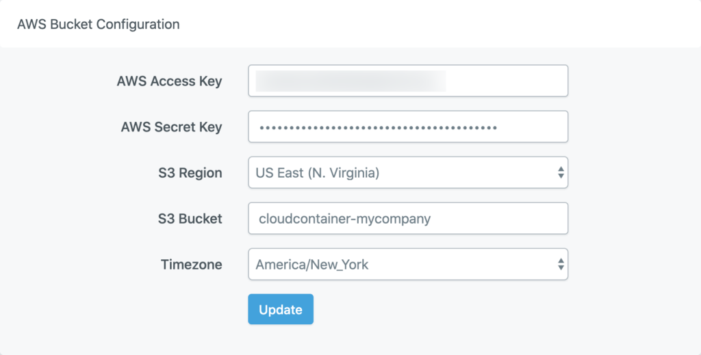 Log in to the CloudContainer admin console and go to the Profile section on the menu on the left. Fill in the AWS Access Key, Secret Key, Region, and Bucket with the values you configured in AWS. The bucket should just be the bucket name, not the full ARN which was used in the IAM policy configuration. Enter the values in their fields and then click Update to save your changes.
