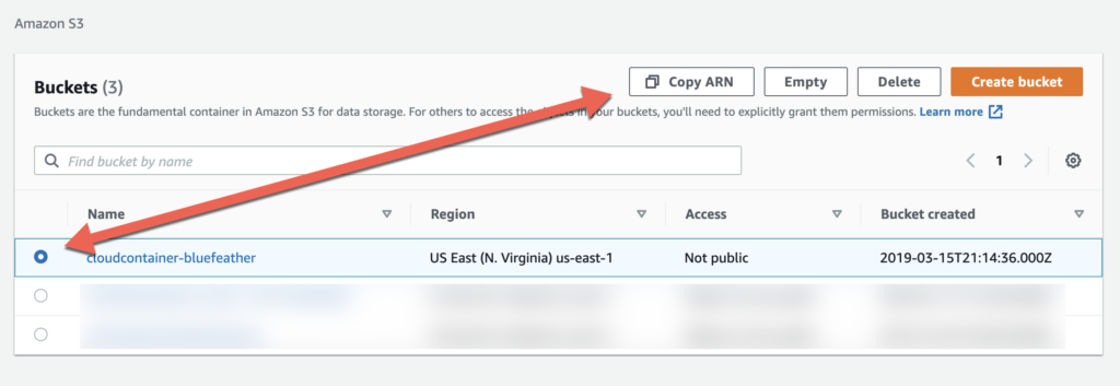 Click the radio button next to your newly created bucket and then click the “Copy ARN button” to copy the ARN (Amazon Resource Name) to your clipboard and make a note of it. This value will be used for setting permissions to access this bucket.
