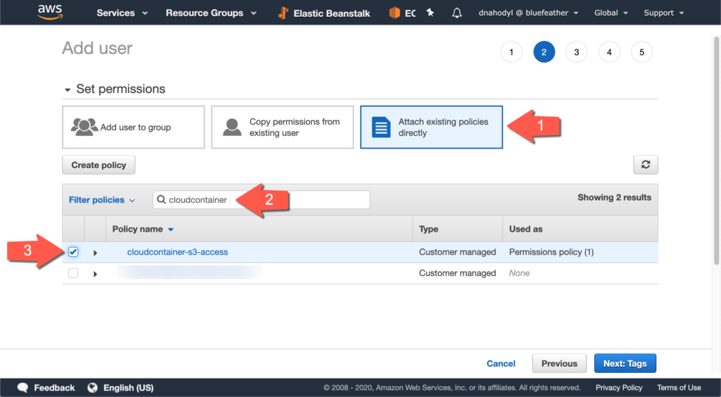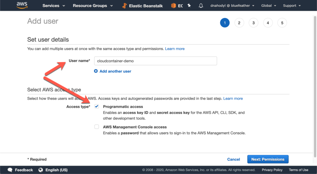 Give the user a name you’ll recognize, such as “cloudcontainer.” To create programmatic access through access keys, you will generate them after you create this IAM user. Click Next: Permissions to move on to the next screen.