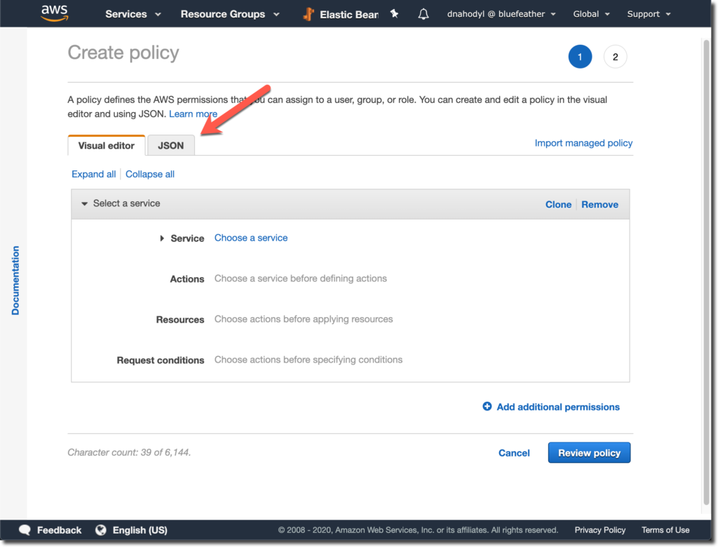 Select the JSON tab. It’s possible to configure the policy using the options on the screen, but it’s simple enough to use the following JSON to set the policy.