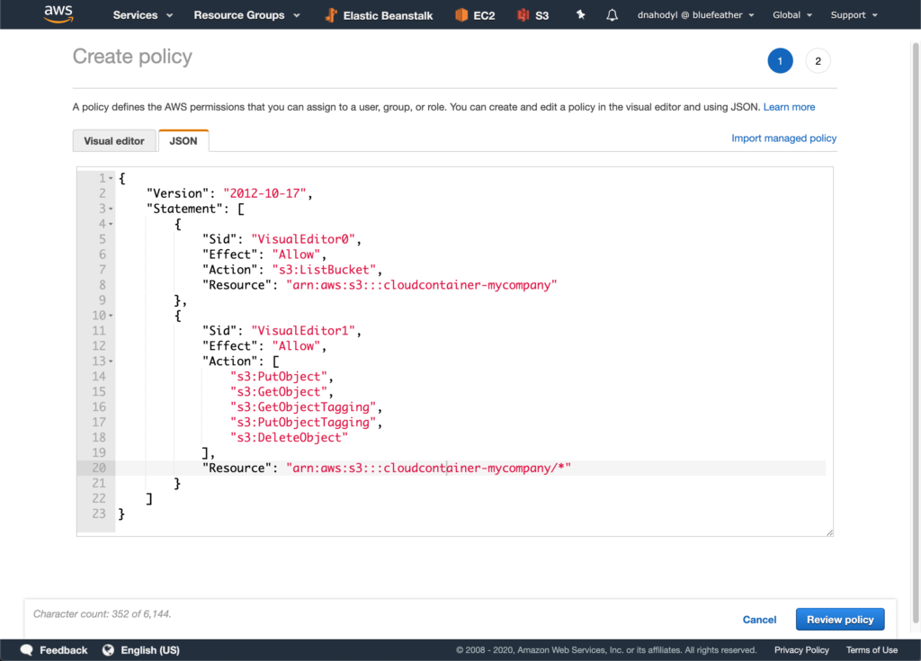 You will need to replace the “Resource” value in the JSON below with the ARN you copied when setting up the bucket. In the sample below the ARN is “arn:aws:s3:::my-cloudcontainer-bucket” and will need to be replaced on lines 13 and 14. Be sure to not delete the trailing “/*” on line 14.