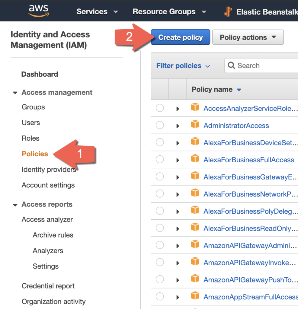 With the S3 bucket created we need to create a security policy which will allow access to the bucket. Go to the Identity and Access Management (IAM) console in AWS which will allow us to create the new security policy. Select the Policies menu on the left and then the Create policy button to make a new security policy.